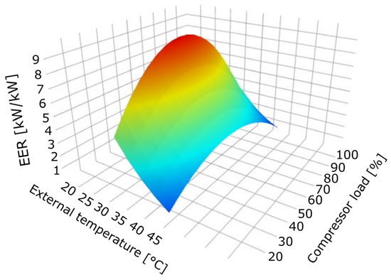 Currently, the YORK YMC2 type water chiller with a centrifugal compressor serves the cooling needs of the building. The specificity of the centrifugal compressor units is that the EER is highly dependent not only on the outdoor temperature, but also on the compressor’s degree of expansion [23]. Hence, operating water chillers with centrifugal compressors at part load can achieve significant efficiency improvements [24]. Therefore, if the chiller runs at night on part load, an improved EER can be achieved (Figure 4).
