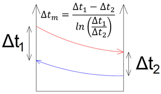 Logarithmic mean temperature difference. (blue line: cooling water in the heat exchanger, red line: air temperature in the heat exchanger).