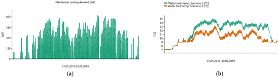 (a) Mechanical cooling demand, (b) water tank temperatures in different scenarios.