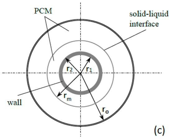 As shown in Figure 1a, the shell-and-tube TES system consists of a group of parallel tubes inside a cylindrical tank. The center-to-center distance between two adjacent tubes is 2ro in Figure 1c. The PCM is filled in the shell space between tubes, while the HTF flows inside the inner tubes and exchanges energy with the PCM by heat convection and heat conduction through the tube wall. To simplify the mathematical model, this physical system to be analyzed can be represented by one unit in Figure 1b with adiabatic condition at the outer PCM surface, assuming the flow is equally distributed in each tube and the cylindrical tank is well insulated thus no heat loss through the TES system. The shell-and-tube arrangement is the most promising for a latent heat storage system requiring high efficiency with a minimum volume [24] and sophisticated experience exists in the manufacturing sector to build shell-and-tube heat exchangers.