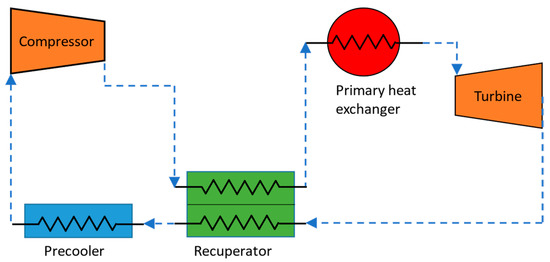 In the current study, a simple closed-loop Brayton cycle (Figure 2) is employed, where, under the conditions of the current study, the efficiency of the cycle is 46% and the efficiency of the primary heat exchanger is 95% [27].