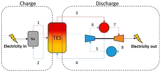 The studied Carnot configuration contains four main elements: the liquid sodium charge tank, the thermal storage system, the HTF-WF (primary) heat exchanger, and the Brayton cycle power block (Figure 3).