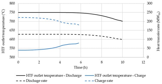 The results of sizing the PCM/graphite hybrid system are summarized in Table 4. After eight consecutive discharging-charging cycles, the discharging-charging process reaches an equilibrium condition, meaning the difference of state of charge at the end of both discharging and charging between the 8th cycle and the cycles afterward is less than 1% [19]. The temperature of the HTF at the outlet of TES system and the heat transfer rate during both the discharging and charging process at equilibrium condition are plotted in Figure 5. The designed hybrid system is capable of providing a storage capacity of 1235 MWhth, with an average discharging and charging rate of 123.5 MWth and 201.8 MWth over a 10-h discharging period and 6-h charging period, respectively, meeting the design criterion.