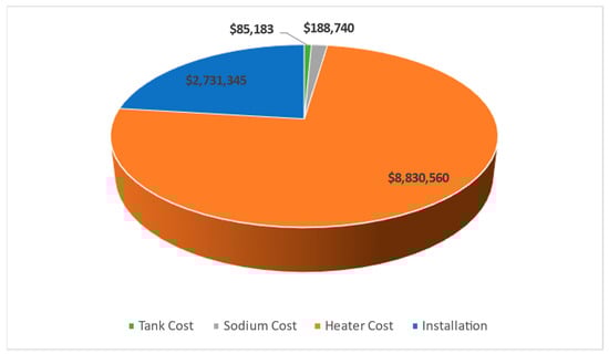 The cost of the liquid sodium charge tank can be calculated using the same methodology for estimating the cost of the storage tanks. Additional costs for the sodium to fill the system and the electrical elements are also included. Using Equations (1)–(3), the volume of the liquid sodium in the system was estimated to be 100.5 m3, with a mass of 78.6 tons. Assuming a tank aspect ratio (H/D) of 2:1, the dimensions of the charge tank are 4 × 8 m (ID × h), with a wall thickness of 6 mm. A cost breakdown of the liquid sodium charge tank costs can be found in Table 5 and Figure 6.