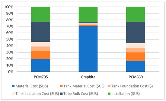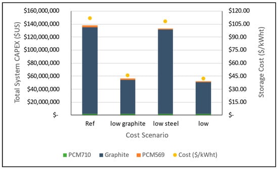 Overall, the costs of the thermal storage system are much higher than previously evaluated systems (e.g., [20,21]) due to the high cost of graphite and steel assumed in the current study. However, there is potential for these costs to be reduced, e.g., through the use of lower quality graphite (assuming the properties are largely unaffected) or a return to lower stainless-steel costs (as seen prior to 2019). To estimate what the impact of these price changes on the cost of the storage system would be, an investigation was carried out to calculate the cost of the thermal storage system with a graphite cost of $2/kg and a stainless-steel cost of $3.5/kg. The results from this investigation are given in Figure 8.