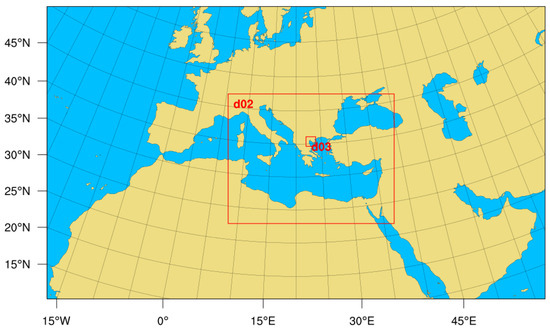 Climate simulations were conducted using the Weather Research and Forecast (WRF) meteorological model v4.1 [16] for the representation of present and future climate in this study. Four telescoping domains for Europe, southeastern Mediterranean and Thessaloniki, with horizontal grid resolutions of 50 km (d01), 10 km (d02), and 2 km (d03), were utilized (Figure 1). The configuration of the WRF vertical layers consisted of 35 unevenly spaced full sigma layers, extended up to 100 hPa. On the basis of previous evaluations of the WRF for the urban area of Thessaloniki [17,18], the physics schemes selected were (a) the Kain–Fritsch cumulus scheme (activated for domains d01 and d02) [19], (b) the cloud microphysics WSM6 [20], (c) the planetary boundary layer YSU [21] coupled with the revised Monin–Obukhov surface layer parameterization of Jiménez et al. (2012) [22], (d) the RRTMG for the short and long wave radiation [23], (e) the Noah land model [24], and (f) the single-layer urban canopy model (SLUCM) for the accurate representation of the urban fabric effects (e.g., street canyons) [25].