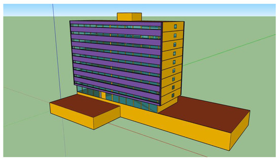 Two key components made up the simulation. After modeling the building geometry in the SketchUp software environment, energy modeling was carried out in TRNSYS [42]. The model was created using information about the actual building’s measurements, architectural features, orientation, and shadings (Figure 2 and Figure 3). Following the building model’s import into TRNSYS, all structural parameters including walls, windows, doors, the schedules for occupancy, lighting, and appliances, the internal loads, and the HVAC system operation schedules and setpoints were defined. The building model was completed by adding the necessary climatic data using the custom weather files (temperature, relative humidity, radiation, etc.).