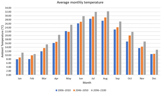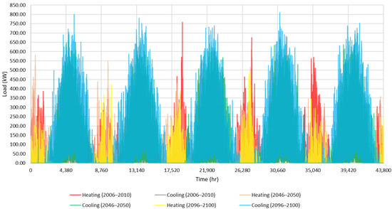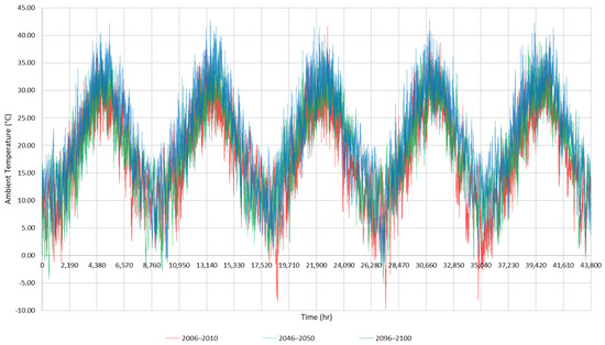 The results of the simulation are presented in this section. Hourly ambient temperature is depicted in Figure 4. Hourly energy demand for heating and cooling (sensible and latent) is illustrated in Figure 5. Furthermore, the monthly energy demand is presented in Figure 6. The temperature increase was evident during each year. It was particularly evident during the summer months with the temperature in several cases exceeding 35 °C during the 5 year period 2046–2050 and 40 °C during the 5 year period 2096–2100. The temperature in the winter period remained almost at the same level for every dataset, with recorded minimum temperatures not exceeding −10 °C.