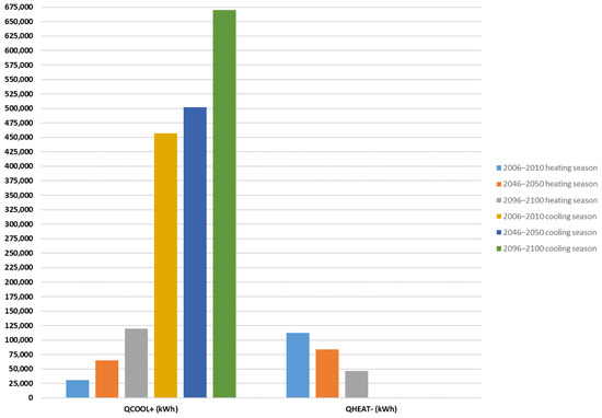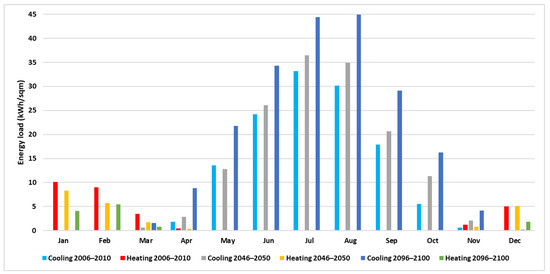 The simulations were implemented for 5 year periods in order to extract manageable and comparable results. The mean monthly energy consumption requirements for heating and cooling for each 5 year period are presented in Figure 7 (specific energy consumption per surface area, kWh/m2). Figure 7 displays the mean annual energy needs for heating and cooling in absolute terms (kWh/year). On the basis of the predicted and meteorological data, it is shown that cooling loads significantly increased, leading to higher energy requirements for cooling than for heating. The most significant energy requirements to satisfy the cooling loads were noted for the 5 year periods 2046–2050 and 2096–2100.