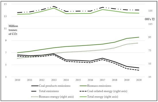 Emissions and energy obtained (various fuels, 2010–2020, Czech households). Source: authors’ calculations based on the data reported in [60,61,67].