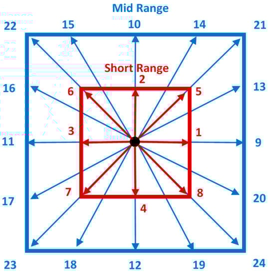 D2Q9 Lattice for short range nodes (red only). D2Q25 Lattice for short- and mid-range nodes (red and blue).