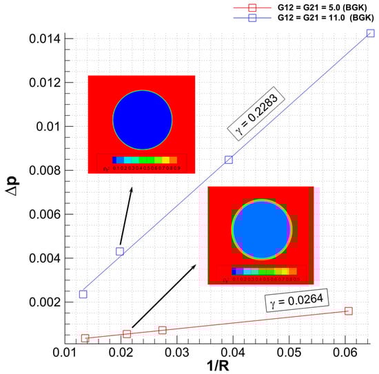 In order to adjust the surface tension with the SC interaction parameters , hence making the connection between the numerical interaction forces and the physical macroscopic property, the Young–Laplace test is always used as a key for model verification. A liquid or gas bubble is initiated in a fully periodic computational domain with a reasonable density for both components accordingly with the chosen interaction parameters. The bubble is then left to reach the steady state, the pressure inside and outside the bubble are evaluated according to Equation (9) or (19), bubble diameter (radius) is measured and the 2D surface tension can be evaluated according to the Young–Laplace equation as follows: