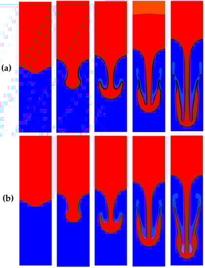 RTI with time plotted on the same density contour levels (Re = 256, At ≈ 0.5, Bo ≈ 100). (a) Resolution: 256 × 1024. (b) Resolution: 1024 × 4096.