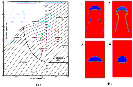(a) Shape regimes for bubble rise after Clift et al. []. (b) Four simulation samples from different points on the diagram.