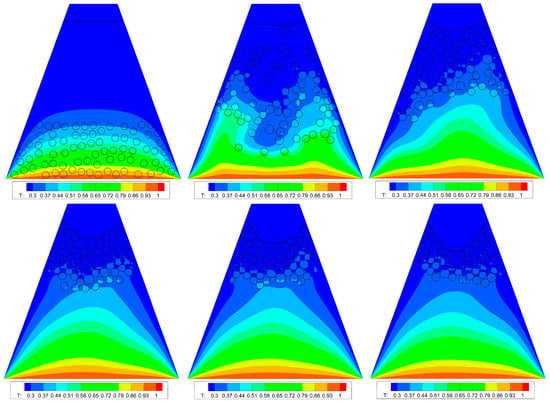 For the study case of thermal foam, randomly generated bubbles are initiated at the bottom of a partially filled flask-like domain and left to rise due to the gravitational effect (buoyancy) as shown in Figure 6. No slip boundary condition is set on the four walls. The thermal field model is implemented, where Dirichlet boundary condition is set for the three and bottom (source) walls. All the simulation parameters are shown in Table 3. The D2Q25 interaction model is implemented to obtain stable foam, while the SC potential function for the interaction between the two components are set using the case B from Equation (8), following the scope of work by Dollet et al. [] and Fei et al. [], as it provided much higher bubble stability than case A. For the other two same-component interactions, case B is still used. The surface tension is re-estimated for this case following the same procedure as in Section 3.1, to evaluate the Bonds number. Although the interaction parameters presented by Fei et al. [] to reach the highest positive disjoining pressure were , and , the required repulsive forces for this bubble rising case between the same components seemed to be higher than the attraction ones in order to maintain stable bubbles.