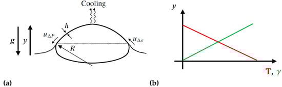 (a) Bubble with lamella showing the drainage direction and Marangoni convection, after Poulain et al. []. (b) Representation of surface tension variation due to temperature gradient.