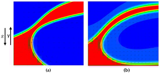 Samples from two simulations are shown in Figure 8, with a spatially variable surface tension and with constant surface tension. The domain is assumed to have linear temperature variation following the schematic on Figure 7b, with a bubble rising from bottom to top until reaching the interface. The case with variable surface tension showed a slightly delayed coalescence, though uninhibited, without using the mid-range interaction model. Flow vectors show flow in a direction opposing the drainage one, as shown in Figure 8a when compared to Figure 8b. Generally, when imposing the surface tension gradient on the bubble, it tends to have slower rising velocity. This can explain, for this situation, the direction of the Marangoni convection.