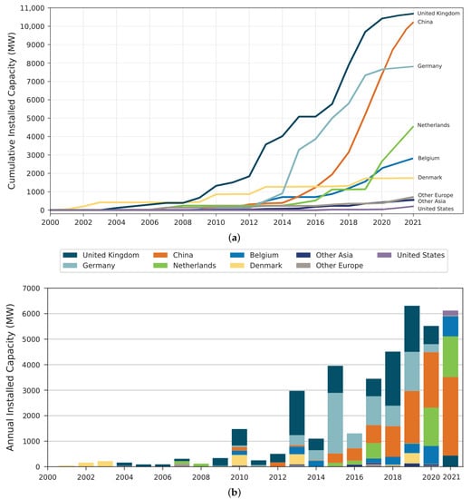 Global cumulative offshore wind energy deployment and annual capacity trends through 2021 [8]. (a) Cumulative installed wind energy trends for countries with the highest record in the past two decades. (b) Annual new installation trends for countries with the highest record in the past two decades.
