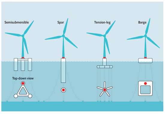 FOWTs are among the concepts that can efficiently and economically capture energy from deep-water offshore wind resources [37,38]. A wind turbine mounted on a floating foundation is part of the FOWT idea, which enables the production of power in deep waters where bottom-fixed wind turbines are not economically feasible. Different floating wind turbine concepts are shown in Figure 2.