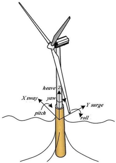 The performance of FOWTs is affected by the displacement in six degrees of freedom (6DOF), which consists of three translational (surge X, sway Y, and heave Z) and three rotational (roll, pitch, and yaw) modes of movement, as can be seen in Figure 3. The motions in 6DOF are caused by the combined influence of the environmental and system restoring loads that act on a floating wind turbine [41].