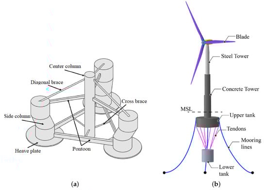 In recent years, researchers have proposed novel floating platforms that take advantage of the strengths of existing concepts and combine them to achieve more cost-effective designs. Fully submersible platforms, for example, combine the advantages of semi-submersible and spar platforms (Figure 5a). This concept employs inclined side columns that are used to increase the water plane and thus the moment of inertia while minimizing the draft and stress on the support structure [65]. A fully submersible floating platform is similar to a semi-submersible one, but the middle parts of the columns are inclined outwards, while the upper and lower parts remain upright to connect to the center column via a set of cross braces and pontoons. This alteration lowers the platform’s center of gravity, which is the primary source of stability in spar platforms, while simultaneously increasing the moment of inertia from which semi-submersible platforms achieve stability [66]. The dynamic response analysis of fully submersible platforms indicates that this type of floating platform has a relatively better overall dynamic performance, and the cost is lower than that of a semi-submersible platform [65].