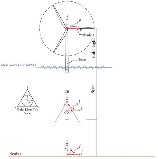 Configuration of a spar-type FOWT and the used coordinate systems [72].