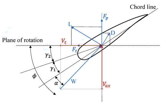 Figure 8 shows a spanwise transversal section of the blade element and the aerodynamic forces acting on it. In this figure, is the inflow angle, indicates the angle of attack, W is the vector summation of the tangential and axial wind velocities, and and represent the blade twist and pitch angles, respectively.