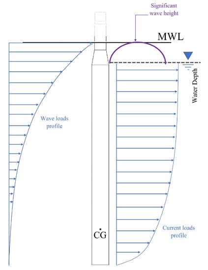where, is the diamater of the cylindrical platform, c and u are the current and wave particle velocities, respectively, and are the structure’s velocity and acceleration, respectively, is the spar’s cross-sectional area, is the local acceleration of the wave particles, and is the spar section’s unit length.
