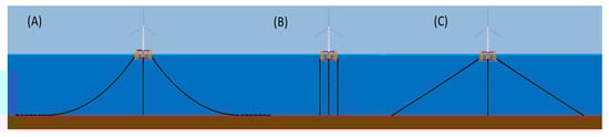 Mooring systems are used to keep the floating platform in position against waves, winds, and currents in order to limit the influence of system displacements on power production. They are also used to achieve stability in some support platform concepts, such as TLPs [54]. FOWTs typically use one of the three conventional mooring configurations, catenary mooring systems, tension-leg mooring systems, and semi-taut mooring systems, or a combination of them (Figure 10), which were initially developed with respect to the needs in the oil and gas sector [104].