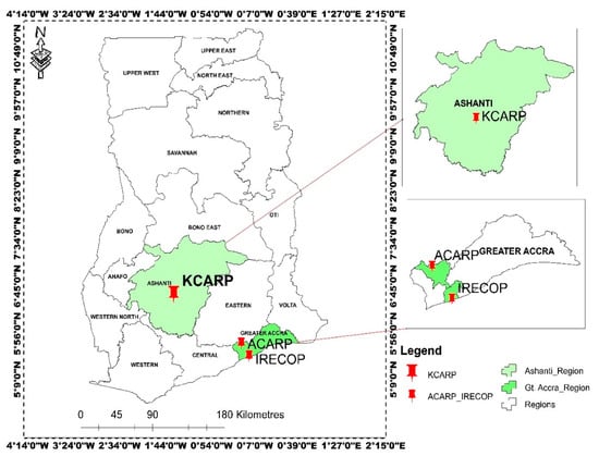 Ghana is situated in West Africa, with a total area of 238,533 sq. km, a 550 km coastal line and a tropical climate and a population of about 30.8 million people [25]. Ghana is divided into 16 administrative regions shown in Figure 1, which are further divided into metropolitan, municipal and district assemblies (MMDAs). The study was carried out in three established waste management (material recovery and compost) facilities in the Accra and Kumasi municipalities. The Greater Accra region is the administrative capital of Ghana, a coastal region and the smallest in the country but the most populated among the 16, while Kumasi is the most urban center within the forest regions.