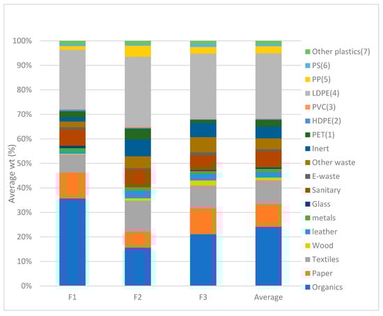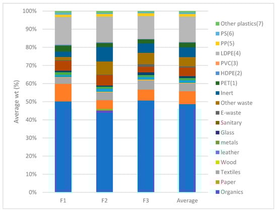 In Figure 3, the average composition of MSW received at the three facilities in weight percentage is shown; the waste was segregated into the components outlined, and the plastic fractions were further separated. The received MSW at the three facilities comprises on average 48.6% organics, 7.1% paper, 20% plastics, 4.2% textiles, 1.2% metals, 1.0% glass, 0.3% wood, 4.8% sanitary waste, 1.5% leather, 0.6% e-waste, 5.6% inert (sand, ash, stones) and 5.3% other waste. The composition of the waste obtained supports studies on MSW characteristics in most developing countries, especially Africa [39] in terms of the high organic fraction (40–60%) proportion of the whole waste. This is unlike the composition of MSW from developed economies such as in the EU, with high dry fractions (>50%) and about 25% kitchen waste [40]. However, the organic fraction recorded was lower (average < 48%) than those reported from household waste characterization studies (50–61%) [41]. The composition obtained was comparable to studies from landfill or disposed waste studies conducted in Ghana [42,43,44]. It can be concluded that waste received at MRFs has similar a composition to that when it is disposed. The composition of the residual/reject fraction (RF) at each facility is presented in Figure 4. This is referred to as the coarse fraction (>60–80 mm sizes) in this study. On average, it comprises 24% organics, 9.2% paper, 34.7% plastics, 9.7% textiles, 1.3% metals, 0.4% glass, 1.2% wood, 6.7% sanitary waste, 2.2% leather, 0.8% e-waste, 4.4% others and 4.8 inert waste (sand, ash, ceramics).