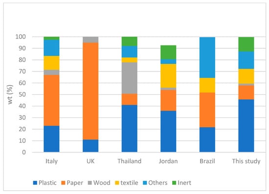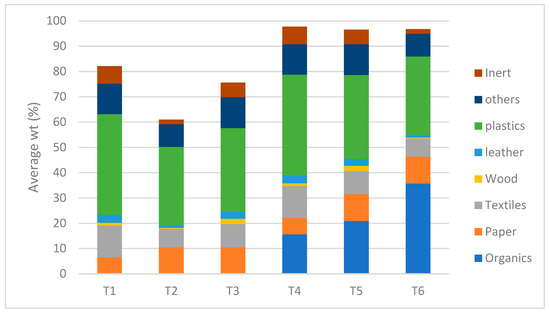 About 70% of the residual fractions in Figure 4 are combustible fractions (including plastics, paper, textiles, leather, wood and others) for possible RDF production. After the waste was sorted into various components, each component’s mass and weight percentages were determined. From the average compositions, two RDF types were considered from each facility sampling, with and without organics, and the average composition is presented in Figure 5. Type 1 (T1, T2, T3) represents only combustible fractions from the RF, while type 2 (T4, T5, T6) represents all the RFs for RDF (except for the non-combustible fractions such as metals and glass). The average RDF from this study has more plastic content than in studies from the other context, in which the paper component recorded the highest fraction (Figure 6). Similarly, RDF originating from other developing countries also recorded high plastic relative to other components. This is potentially attributed to the high level of single-use plastics and contamination levels in plastics for other uses in such context [48,49]. From the specific weight of components, the RF was on average about 30–48% by weight of the initial waste, compared with 43.1% [24], 33.4% [23] and 42% [3] recorded from other studies. Hence, the suitability of the RF for RDF production is enshrined in achieving sustainability within the practices of waste management.