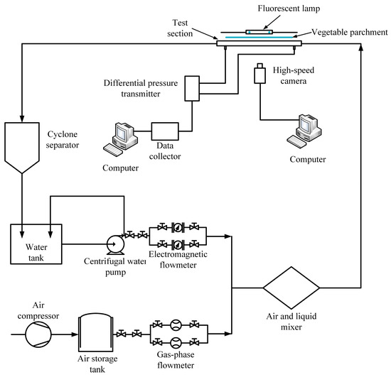 The measured parameters in our experiment were the fluid velocity and air–water pressure drop. Differential pressure transducers measured the total pressure drop, ΔPtotal. Flow meters measured flow velocity of air and water. A data acquisition system simultaneously recorded the data obtained by the pressure difference transducer and flow meters.