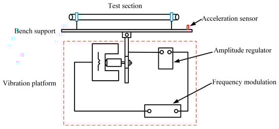 The experimental circuit was connected to the vibration device in this experiment. Both ends of the experimental section were fixed on the vibration table, which provided transverse vibration conditions. The experimental test section reciprocated horizontally in the horizontal flow direction. The experimental system and vibration device are shown in Figure 1 and Figure 2. The experimental test pipe, as shown in Figure 2, is the essential portion of the system where we examined the air–water flow characteristics. The pipe diameters of the experimental test pipe were 20 mm. The length of the experimental test pipe was 1400 mm. Pressure extraction holes were set at 300 mm points from the entrance and exit of the experimental pipeline. The spacing between the two measuring points was 800 mm. The vibration table generated a simple harmonic motion with adjustable frequency and amplitude.