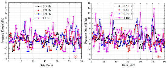 Figure 4 and Figure 5 display the fluctuation of the ΔPf of air–water at various frequencies and amplitude, respectively. We analyzed the effects of the frequency and amplitude. Figure 4 shows the vibrational characteristics of ΔPf become more intense with the increase in frequency; this occurs because the increasing frequency increases the instantaneous average speed of air and water. With the increase in the average velocity of air and water, the applied force between the two-phase fluid and the inner wall becomes larger. Then, the vibrational characteristics of ΔPf become intense. As seen in Figure 5, the vibrational characteristics of ΔPf also become more intense with the increase in amplitude because gas–liquid interface collision intensifies with the increasing amplitude. The average speed of air and water becomes larger. Thus, the increasing frequency and amplitude leads to a more intense vibrational characteristic of ΔPf.