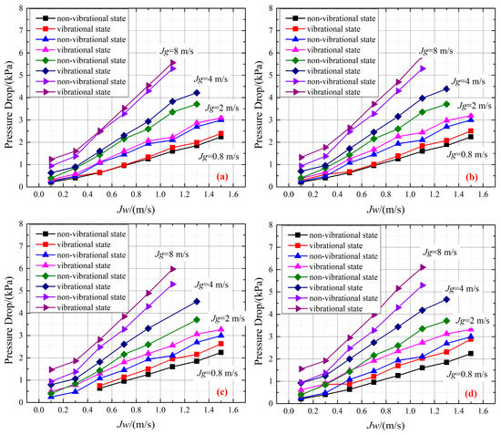 Figure 6 shows the ΔPf of air–water versus the liquid phase conversion flow velocity under vibrational and non-vibrational states. We analyzed the effect of vibration. As seen in Figure 6, ΔPf under the vibrational state is bigger than the value under the non-vibrational state.