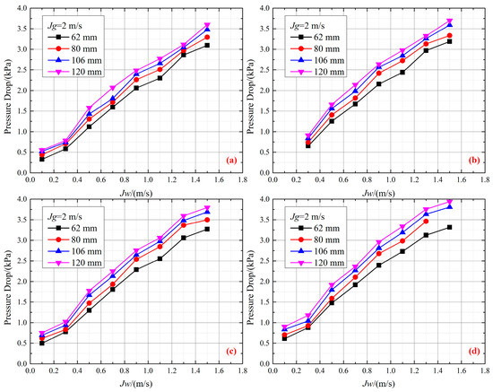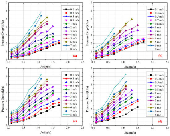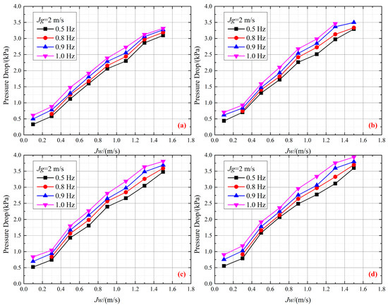 Figure 7 shows the ΔPf of air–water versus the liquid phase conversion flow velocity under various frequencies. We studied the impact of flow velocity on the ΔPf. As shown in Figure 7, ΔPf increases with the increased fluid velocity; this can be interpreted as the air–water average velocity increasing with the increase in fluid velocity. The acting force of the two-phase fluid and the inner wall increases with the air–water average velocity. Thus, the ΔPf increases.