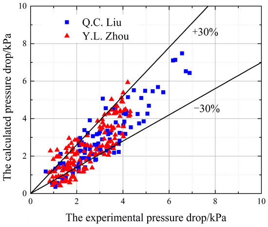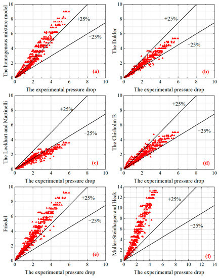 The comparison results between the predictive models and experimental data are shown in Figure 11. The ΔPf were calculated with the Lockhart–Martinelli, Dukler [42], Chisholm, Friedel, homogeneous, and Muller and Heck [43] models.