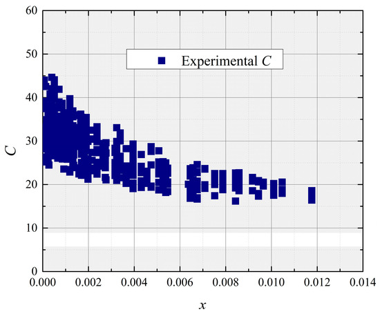 From the above analysis, the air–water frictional pressure drop value under the transverse vibration condition in the horizontal channel by the existing correlation coefficient is slightly higher or lower. Therefore, we propose a new correlation considering reasonable parameters to improve the prediction accuracy. As shown in Equation (7), the C coefficient improves the correlation’s prediction of experimental data, and the C value relates to the flow characteristics of the fluid. Therefore, to consider reasonable parameters, we established the C coefficient correlation.