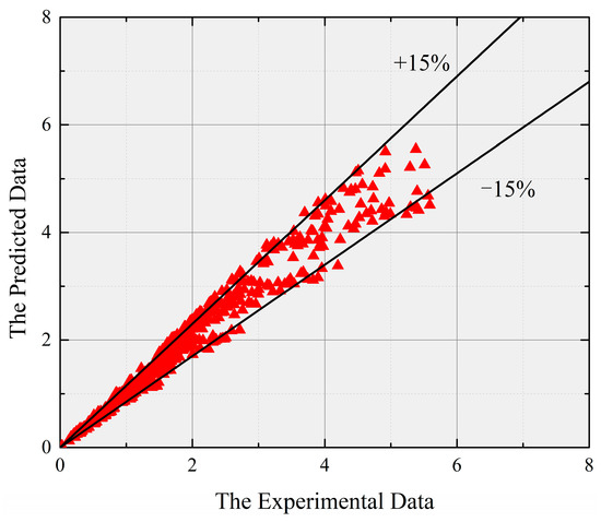 Figure 13 shows the values of the ΔPf calculated by newly developed correlation. Table 4 lists the experimental ΔPf deviation calculated by the developed model. The newly developed model is superior to the Dukler correlation in predicting experimental results under lateral vibration. For the newly developed correlation, the MAD and MRD are 8.2 and 1.4%.