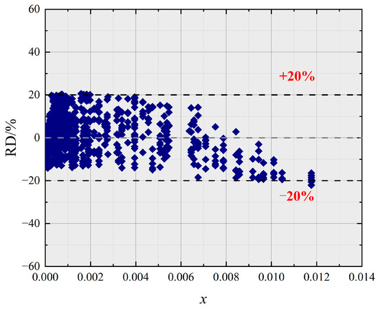 Figure 14 displays the variation in RD versus x. The results show that as the newly modified correlation considers the effect of x, the impact of x on the performance of the newly modified correlation is minor.