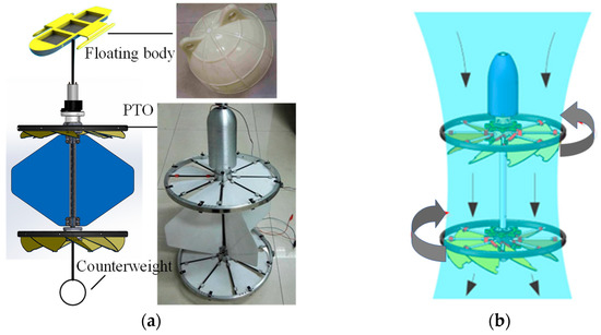 To address this problem, a small-size counter-rotating self-adaptable wave energy converter (CRWEC) was developed for unmanned marine equipment in a previous study by our group [15,16,17]. As shown in Figure 2a, our CRWEC consists of a PTO (energy-converter module), a floating body (wave-energy-capture module), and a counterweight (auxiliary module). The working principle of the PTO is shown in Figure 2b: it contains two counter-rotating blade groups. Under the action of the floating lift generated by the waves and the gravity of the counterweight, the rising and sinking motion generated by the PTO drives the two blade groups to rotate at a reverse differential speed, which drives the motor to generate electricity. In this design, the PTO uses flat blades to absorb energy, and the efficiency of the PTO is 26%. In a later, optimized design [15,16,17], flexible flat blades are used to improve efficiency to 37%. Even so, the efficiency of the blades still needs to be further improved by a new design.