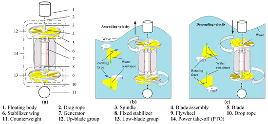 By adopting a similar principle and structure to the CRWEC and substituting the flat blades with morphing blades, we obtained a newly designed PTO. As shown in Figure 3a, the PTO consists of one float body 1 to capture wave motion, one drag rope, two counter-rotating morphing-blade groups 12 and 13, two generators 7, one drop rope 10, and one counterweight. In order to avoid the efficiency loss caused by mechanical transmission, we did not use the CRWEC’s gear-differential transmission, so the blade group directly drives the motor to generate electricity.