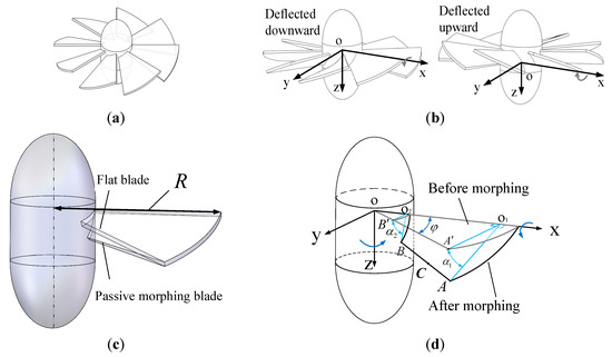 The passive morphing blade, as shown in Figure 4a–c, is derived from the shape of the flat blade, with the exception being that the passive morphing blade has a greater internal deflection. As shown in Figure 4d, the passive morphing blade’s deflection angle varies linearly along the X-axis. Before deflection, the two points, , on the passive morphing blade are in the rotation plane of the blade group. After deflection, the two points , on the passive morphing blade are deflected to their respective positions, and the deflection angle of is greater. The passive morphing blade is formed by extruding the surface , which can be expressed as