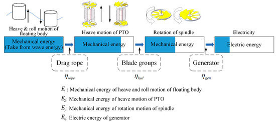 As shown in Figure 5, the conversion from wave energy to electrical energy is an energy-decay process. First, the floating body captures the wave energy and converts it into the mechanical energy of its heave and roll motions (); then, the floating body transfers the energy to the PTO through the drag rope and converts it into the mechanical energy of the PTO heave motion (); the mechanical energy of its heave motion is converted into the mechanical energy of the spindle rotation (); and, finally, the generator uses the rotational motion to generate electricity ().