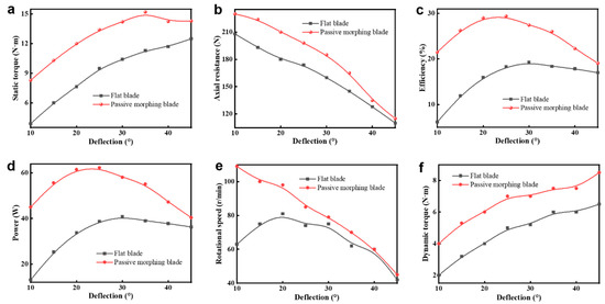 Effect of blades type and deflection angle on PTO: (a) static torque; (b) axial resistance; (c) efficiency; (d) dynamic torque; (e) power; (f) rotational speed.