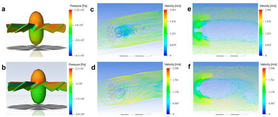 The diameter of the twisted-blade group’s wake field is 320 mm, which is smaller than the flat-blade group’s (440 mm, as shown in Table 2 and Figure 8c–f). The passive morphing-blade group is more conducive to energy absorption, so the diameter of the vortex region is smaller, which is conducive to the smooth operation of the PTO.