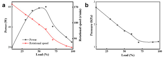 As shown in Figure 10a, the power of the blade group increases with the load when the load is less than 60% and reaches a larger value at a 40~60% load. However, the power and rotational speed decrease sharply when the load exceeds 60%. Therefore, the blade group’s load should be in the range of 40~60% of the static torque to obtain the maximum power and hydraulic-conversion efficiency . The pressure trend of on the blade is consistent with the speed, as shown in Figure 10b.