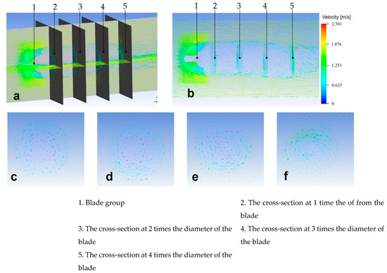 As shown in Figure 11c–f, the back-flow and reverse vortex are unavoidable, but they always occur within a distance of four times the blade diameter; the reverse vortex in the cross section at four times the blade diameter is largely invisible, as shown in Figure 11f. Therefore, the two blade groups’ distances should be greater than four times the diameter of the blade group. The reverse vortex field length is close to the back-flow field, and a spoiler should be installed inside the PTO to reduce the influence of the reverse vortex on the other group of blades [7].