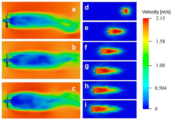 (a) Wake field of 6-blade group; (b) wake field of 10-blade group; (c) wake field of 16-blade group; (d) wake field when the blade group moves to 0.3 s; (e) wake field when the blade group moves to 0.9 s; (f) wake field when the blade group moves to 1.3 s; (g) wake field when the blade group moves to 1.4 s; (h) wake field when the blade group moves to 1.5 s; (i) wake field when the blade group moves to 1.6 s.